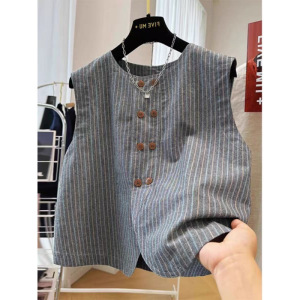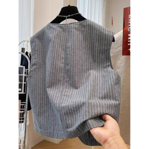 高端棉麻亚麻条纹无袖短款外穿西装马甲背心女夏季薄款外套上衣潮