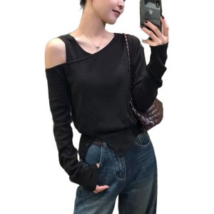 2025秋季复古俏皮设计感侧露肩假两件显瘦上衣气质时尚T恤女