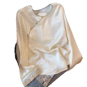 新中式真丝桑蚕丝上衣年轻款缎面提花长袖小衫独特气质衬衫女秋季