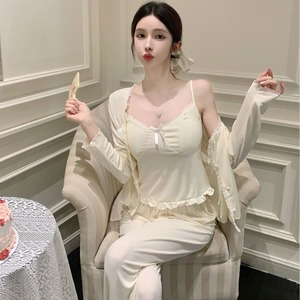 秋季新款睡衣女莫代尔三件套高级感长袖长裤简约居家服小香风带胸
