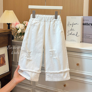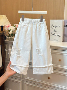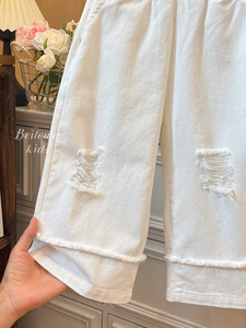 新款女童秋季百搭白色破洞休闲裤女宝宝韩版休闲时尚洋气品质童装
