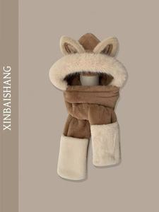 红色狐狸毛绒帽子围巾一体女款秋冬季围脖保暖帽子三件套加绒加厚