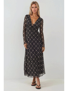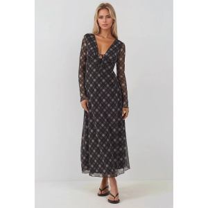 跨境欧美2025秋季新款时尚复古V领系带格纹优雅气质修身连衣裙