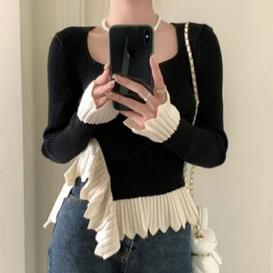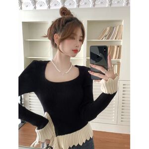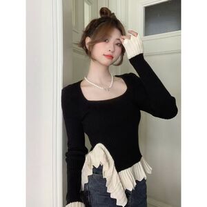 2025春秋法式荷叶边撞色拼接不规则针织衫女百搭方领短款打底毛衣
