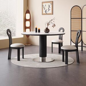 简约原木风洞石岩板小圆桌餐桌家用小户型圆形饭桌设计师桌子实木