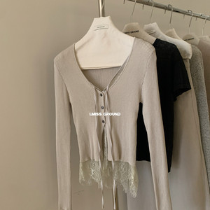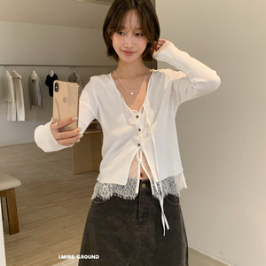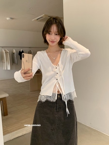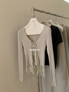 I MISS2025秋季新款蕾丝拼接假两件系带针织开衫女修身显瘦上衣