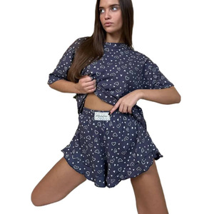 跨境2025夏季新款荷叶边时尚短裤短袖冰丝螺纹印花可外穿睡衣套装