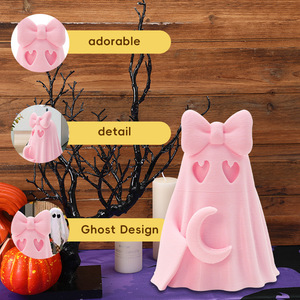 跨境新款 万圣节可爱幽灵与月亮节日桌面粉色蝴蝶结幽灵塑料摆件