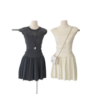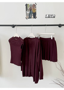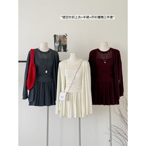 2025早秋新款韩版气质镂空无袖针织衫+百褶短裙+针织开衫三件套女