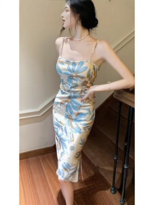 纯欲风吊带连衣裙女夏季薄款高级感印花开叉包臀裙收腰显瘦中长裙