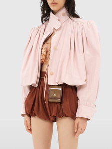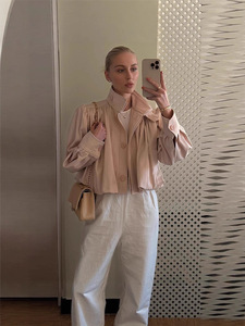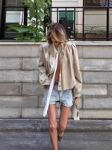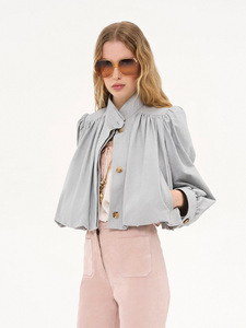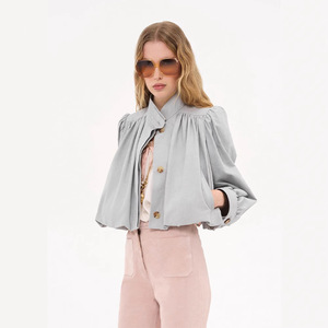 跨境欧美风女装秋季气质百搭休闲风泡泡袖纯色单排扣短款风衣外套