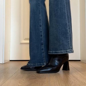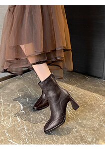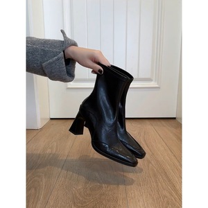 韩系粗跟方头小短靴复古弹力瘦瘦靴女后拉链高跟单靴