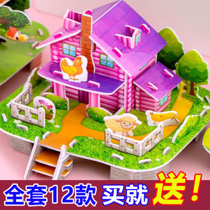 【12套不重复】幼儿园益智手工3D立体拼图玩具拼装房子礼物跨境