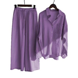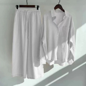 跨境亚马逊女士2件套复古加大码 2025棉麻衬衫套装高腰宽松长裤