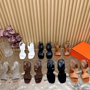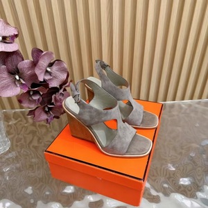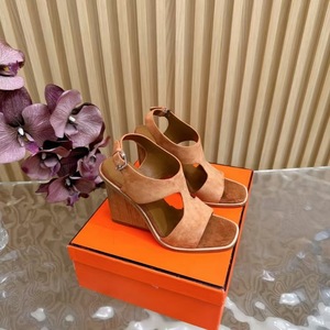 高版2025夏秋新款大码真皮底坡跟木纹跟漏趾一字搭扣高跟凉鞋女