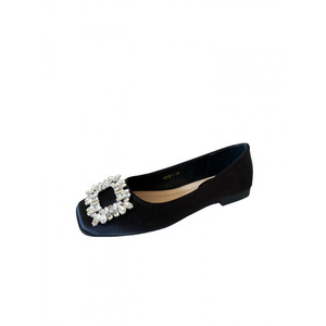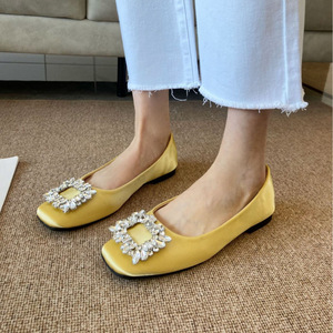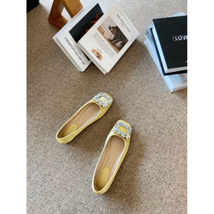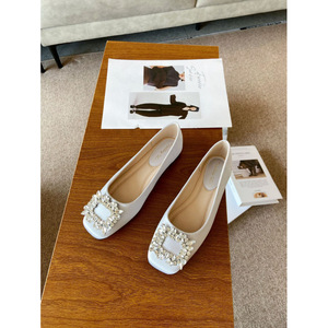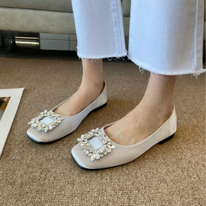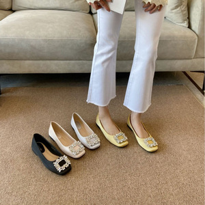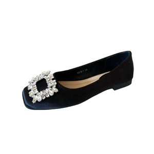 2025新款春秋浅口平底黑色水钻百搭通勤工作鞋子女方头方扣单鞋