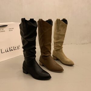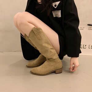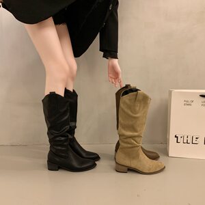 秋季绒面粗跟堆堆高筒靴2025新款骑士靴西部口棕色V长筒靴女