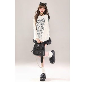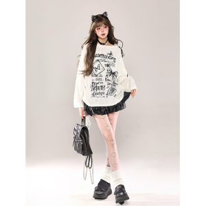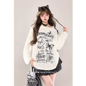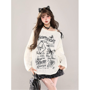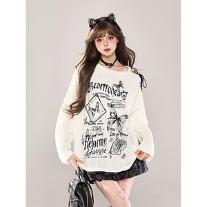 欧美跨境外贸辣妹斜肩破洞罩衫长袖T恤女春秋宽松显瘦设计感上衣