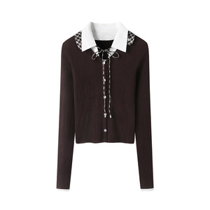 现货2025秋新品可卸格子领针织开衫上衣72801113