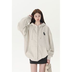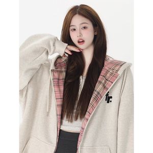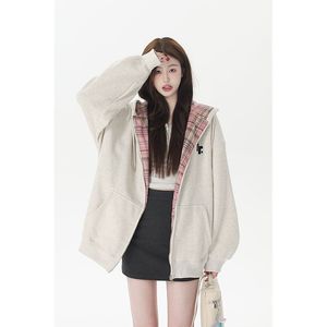 2025秋冬季设计感格子拼接格纹拉链外套韩系校园风宽松连帽女卫衣