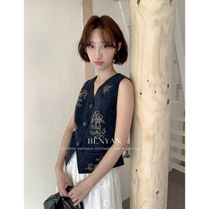 BENYAN本言 法式名媛轻奢重工钉珠花朵V领马夹麂皮马甲背心82305