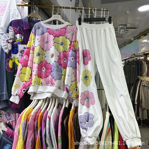 欧货设计感烫钻立体花朵宽松长袖卫衣上衣+松紧腰阔腿长裤两件套