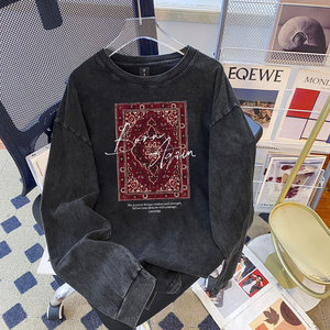 别致时尚气质100%纯棉长袖t恤欧美风复古洋气oversize百搭上衣潮