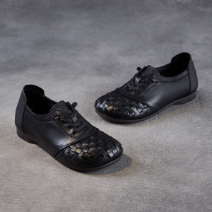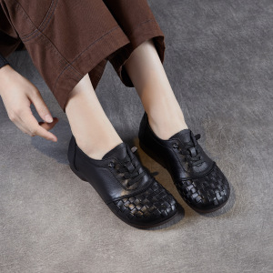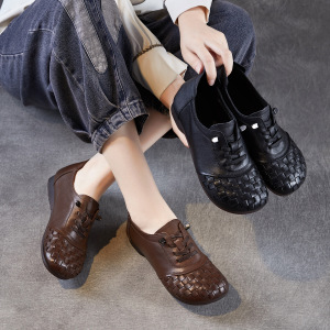 文艺复古真皮编织女鞋2025秋季新款头层牛皮系带软底软面妈妈单鞋