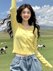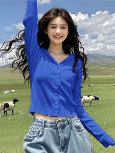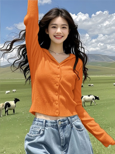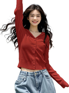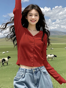 安哥拉红色V领连帽毛衣针织衫女2025新款早秋季多巴胺氛围感上衣