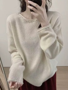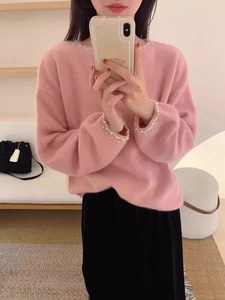 韩系重工钉珠纯色圆领针织2025秋冬新款小香风洋气百搭套头毛衣女