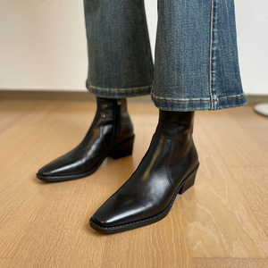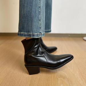 巨好看~真皮复古做旧切尔西靴女5.5cm粗跟2025秋新款拉链百搭短靴
