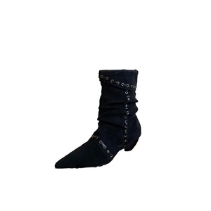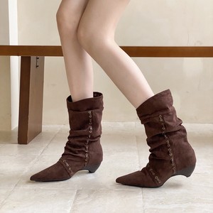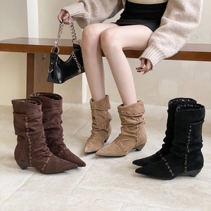 小众设计两穿尖头中筒靴2025秋冬新品百搭褶皱粗跟堆堆靴骑士靴女