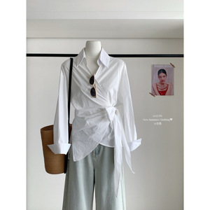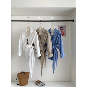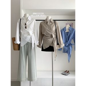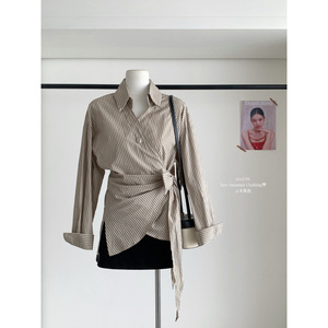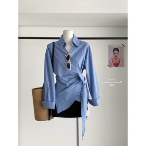 塞纳2025早秋新款韩系气质不规则设计感系带女长袖条纹衬衫