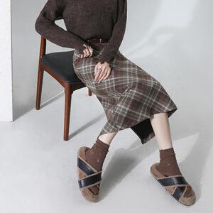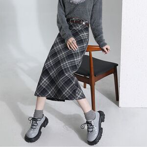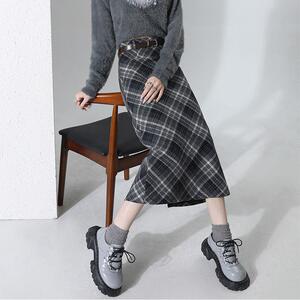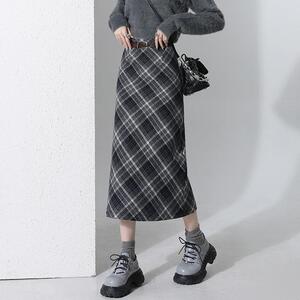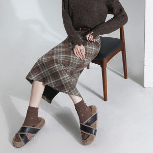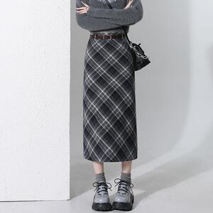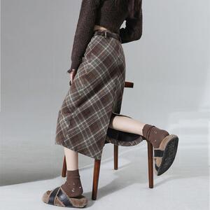 复古格子毛呢半身裙女2025秋冬腰带款后开叉腰A字裙包臀中长裙