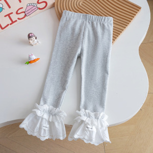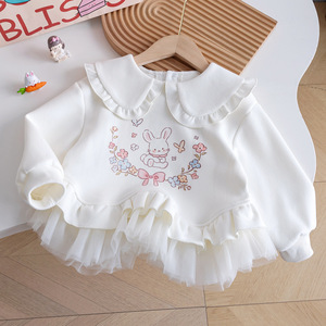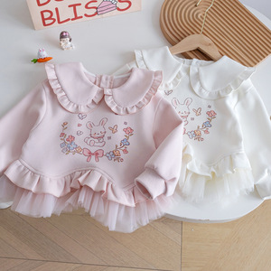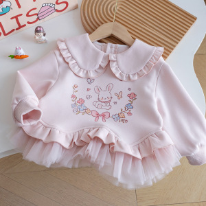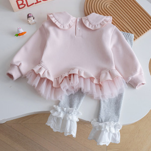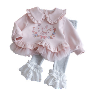 女童秋季甜美公主风套装新款卡通萌兔印花拼接网纱卫衣+蕾丝裤脚