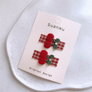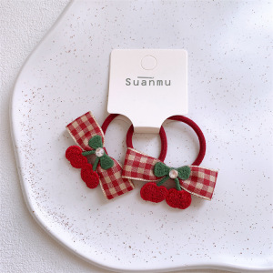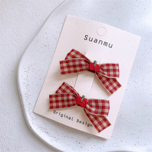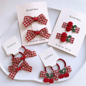 儿童红色格子蝴蝶结樱桃发夹发圈女童刘海碎发BB夹扎头发皮筋头绳