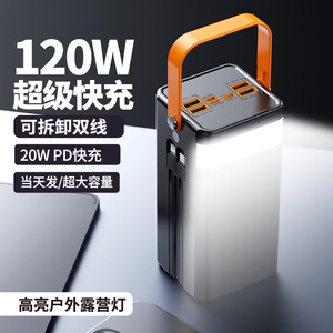自带线充电宝60000mAh大容量120W超级快充户外露营灯移动电源跨境