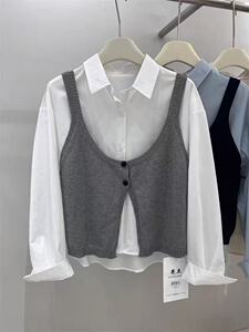 新款V领针织背心马甲两件套女休闲百搭衬衫套装