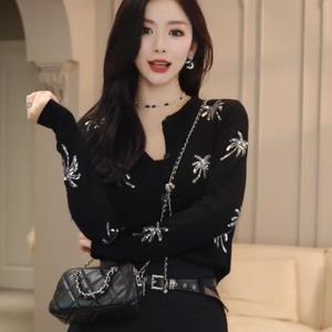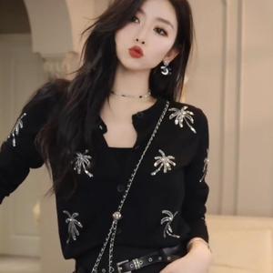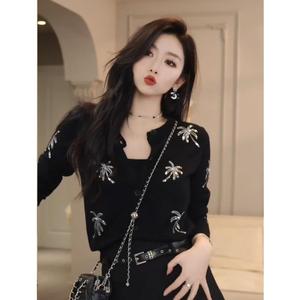欧货黑色珠片绣花针织开衫女2025春秋新款设计感小众时髦洋气上衣