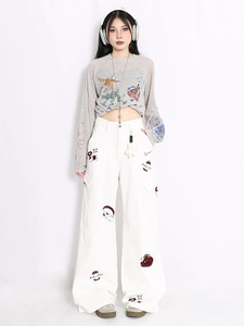 趣味小狗刺绣多口袋工装牛仔裤女秋季新款休闲百搭白色宽松直筒裤