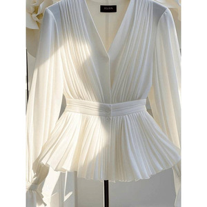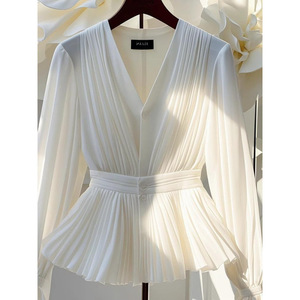 早秋新款气质V领长袖上衣轻熟法式小众独特漂亮小衫轻奢白色衬衫