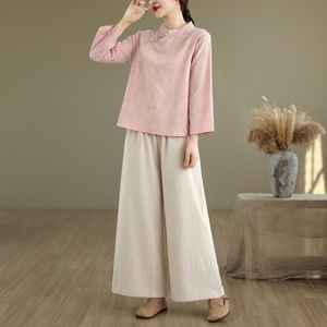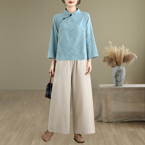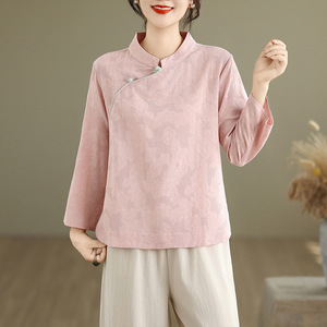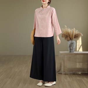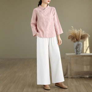 中国风立领提花斜襟中式棉麻衬衫女复古上衣茶服禅意套装
