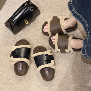 香港2025秋冬毛毛鞋小众羊羔毛高级感厚底外穿复古皮带扣棉拖鞋女