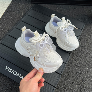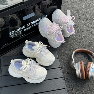 女童珍珠蝴蝶结小女孩运动鞋2025秋季新款儿童百搭网面透气老爹鞋