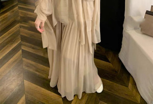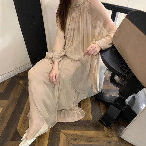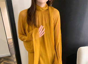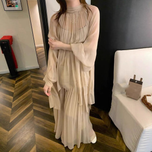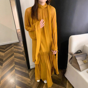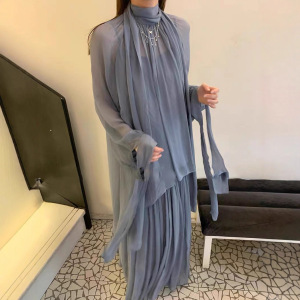 25早秋款法式度假风不规则压褶飘带高领飘逸上衣+半裙