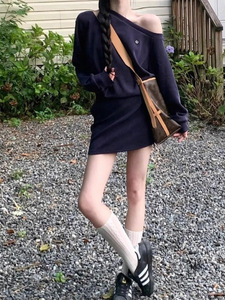 法式复古风斜肩长袖卫衣连衣裙女装春季辣妹收腰包臀裙藏蓝色短裙