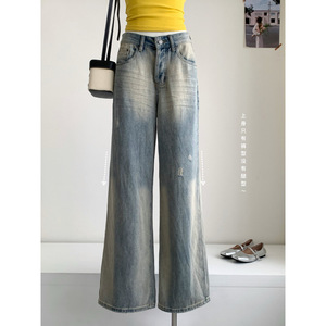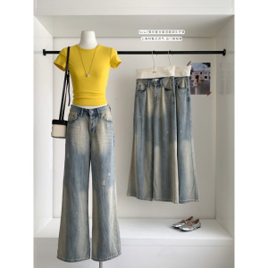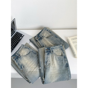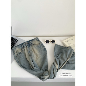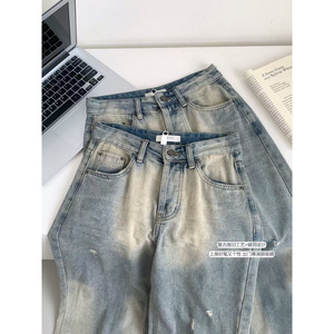 塞纳2025新款脏脏牛仔裤女时髦不对称做旧水洗手工吊磨直筒长裤