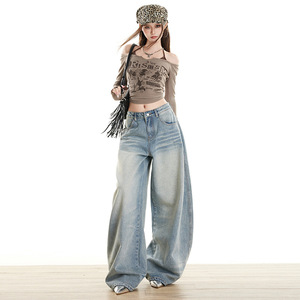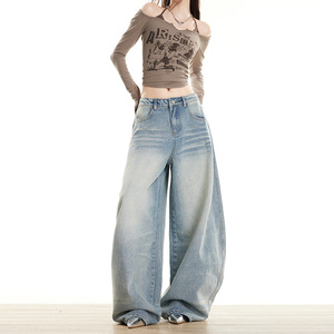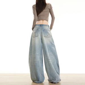 美式复古水洗弯刀牛仔裤女2025年春秋新款直筒宽松高腰显瘦阔腿裤