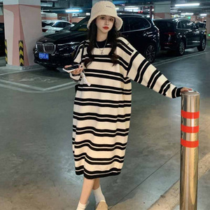 秋冬韩版宽松针织连衣裙长款过膝条纹打底衫慵懒风毛衣裙外穿圆领