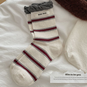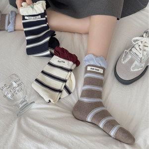 花苞袜子女中筒袜秋冬新品韩版ins条纹棉堆堆袜miu布标无骨长筒袜